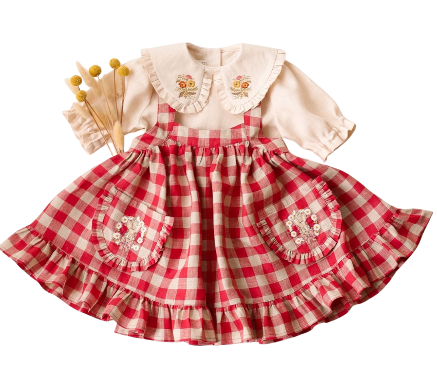 Vestido estilo pradera en tono marrón rojizo, con mangas abullonadas y moño trasero.