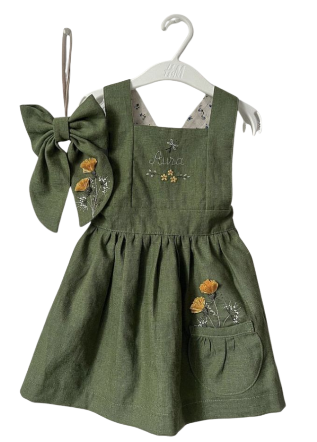 Vestido de volados en tono verde oliva, confeccionado en algodón orgánico. Perfecto para días cálidos o sesiones de fotos al aire libre.